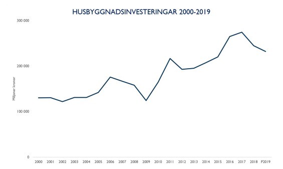 Det visar sig att de påbörjade husbyggnadsinvesteringarna har utvecklats starkt under det senaste decenniet jämfört med 2000-talet och kraftigast uppgång skedde under den senare halvan. Totalt ökade investeringsvolymen med över 50 procent under 2010-talet och om NAVET Analytics prognos slår in för 2019 (ett kvartal återstår innan fjolåret kan summeras helt), väntas husbyggnadsinvesteringarna vid utgången av 2010-talet överstiga utgången av 00-talet med drygt 100 miljarder kronor, detta trots de senaste två årens nedgångar. Den kraftiga uppgången har i stor utsträckning drivits av ett ökat bostadsbyggande och ett omfattande behov av offentliga lokaler. Ett lågt ränteläge och god ekonomisk tillväxt under perioden har varit viktiga drivkrafter för utvecklingen.
