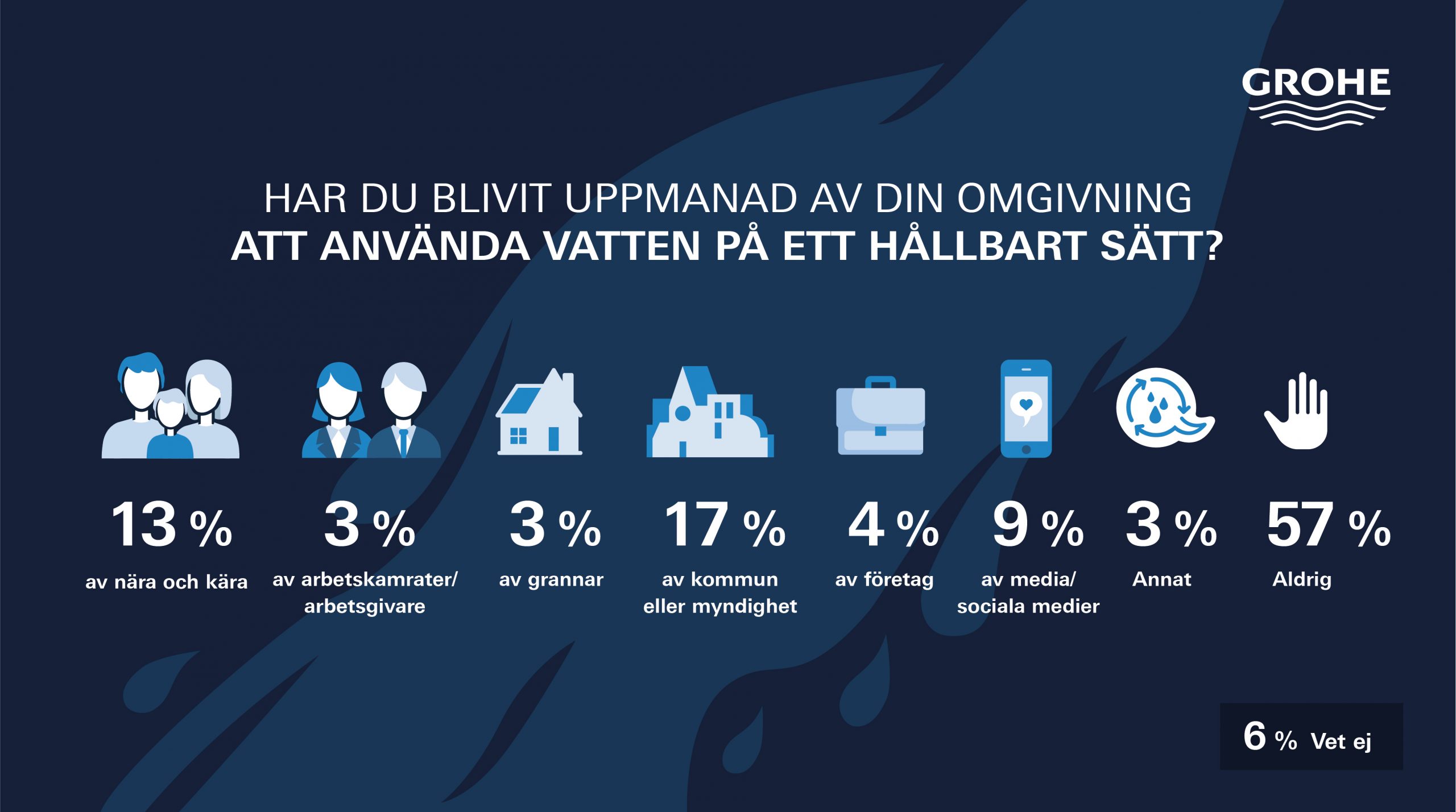 Varje år frågar GROHE nordborna om olika aspekter kring vattenanvändning. Årets upplaga av Vattenbarometern visar att majoriteten av svenskarna inte uppmanas om att spara vatten från vare sig kommuner eller myndigheter. Endast 17 procent säger att de har informerats den vägen.