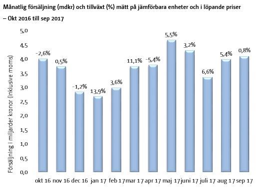 Byggmaterialhandeln fortsätter att utvecklas positivt. Försäljningen ökade i september med 0,8 procent mätt på jämförbara enheter och i löpande priser jämfört med samma månad föregående år. Antalet vardagar var en färre i september i år än i september i fjol, vilket försvagar utvecklingen. Hittills i år, det vill säga perioden januari-september, har försäljningen ökat med 4,4 procent avseende jämförbara enheter.