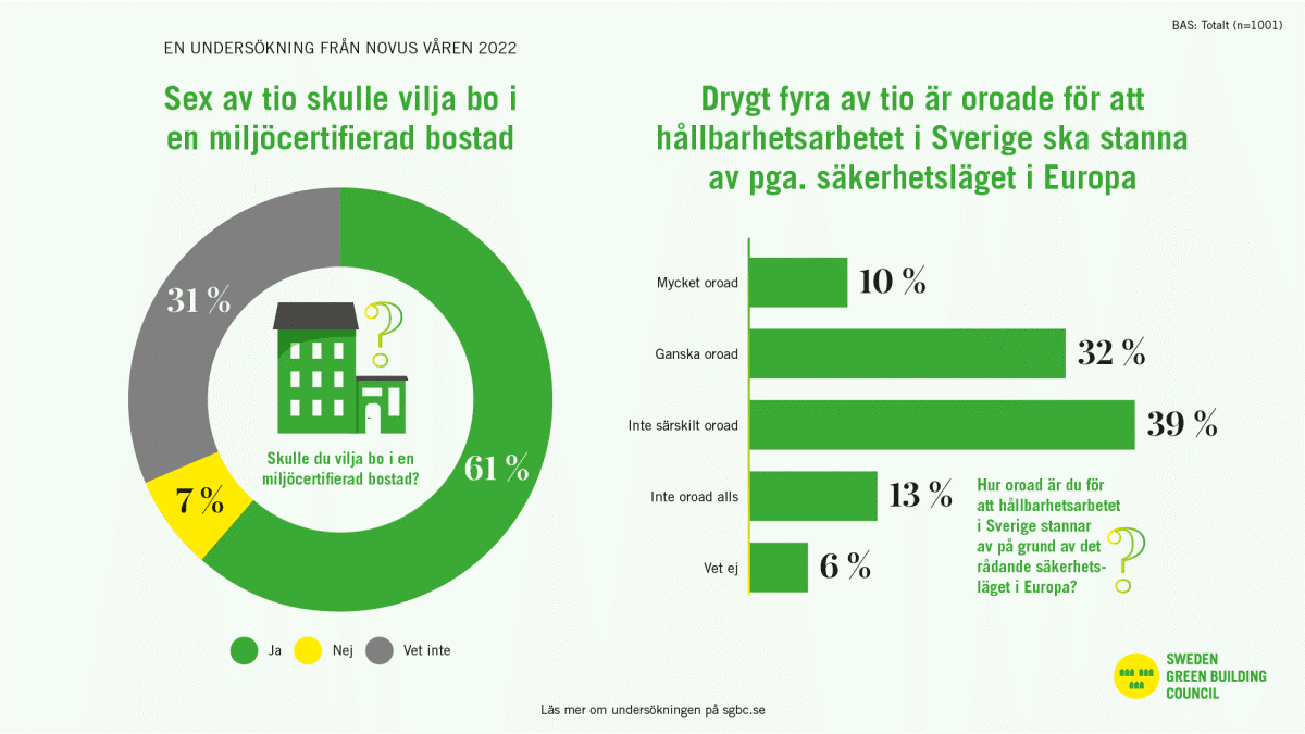 Drygt fyra av fem svenskar, 83 procent, betecknar sig som miljö- och klimatmedveten och många vill såväl bo som arbeta i en miljöcertifierad byggnad. SGBC gjorde tillsammans med Novus en undersökning 2021 där samma fråga ställdes med resultatet 82 procent. Trots att en så stor andel av de tillfrågade anser sig vara klimatmedvetna är det fortfarande låg kunskap om de miljöcertifieringar som finns för byggnader, till skillnad mot miljömärkningen Svanen som hälften av svenskarna känner till.
