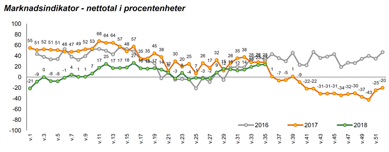 Efter en längre nedgång av Valueguards marknadsindikator hösten 2017 steg indikatorn igen under de sista veckorna 2017 och de första veckorna 2018. I början av året låg indikatorn kring noll för att i mars stiga till kring 20, där den låg fram till början av maj. I maj gick indikatorn ner igen och låg under hela juni och början av juli kring noll. I slutet av sommaren har indikatorn stigit och ligger nu en bit över 20