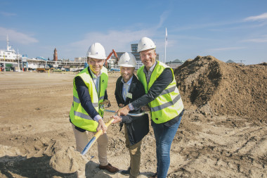 Längst ut på piren i Oceanhamnen i Helsingborg, med full utsikt över Öresund, grävdes idag det första spadtaget för ett nytt World Trade Center och ett Scandic-hotell. Peter Danielsson från Helsingborgs stad, Thomas Hansen från Scandic Hotels och Peter Syrén från Midroc lyfte gemensamt spaden som en symbol för starten på projektet.