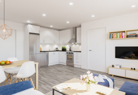 Trevåningshuset som har totalt åtta lägenheter kommer att stå helt klart i augusti 2017.