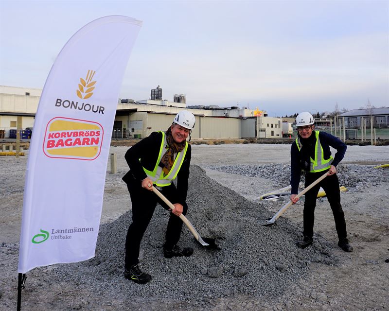Nu är första spadtaget taget av Unibake Sveriges vd Jonas Lindell och Lantmännen Fastigheters vd Joachim Haas.