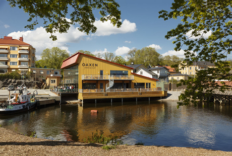 Särskilt viktigt för det goda resultatet är det före detta slipskjulet som idag inrymmer Oaxen Krog & Slip. Fasaderna är nu liksom förr klädda med sinuskorrugerad plåt och den tidigare helt öppna fasaden mot väster, där båtar rullades in, har ersatts med en stor glasvägg med utsikt över varvet och Beckholmen.”