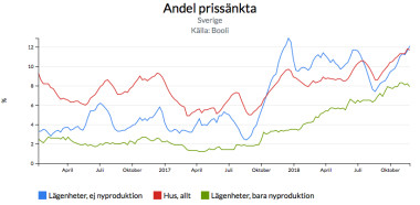 Statistik från bostadssajten Booli visar att andelen prissänkta bostadsannonser är den högsta sedan Booli började mäta 2008 i flera län. I nästan alla län har andelen prissänkta annonser, oavsett objektstyp, varit högre hittills i år än 2017.
