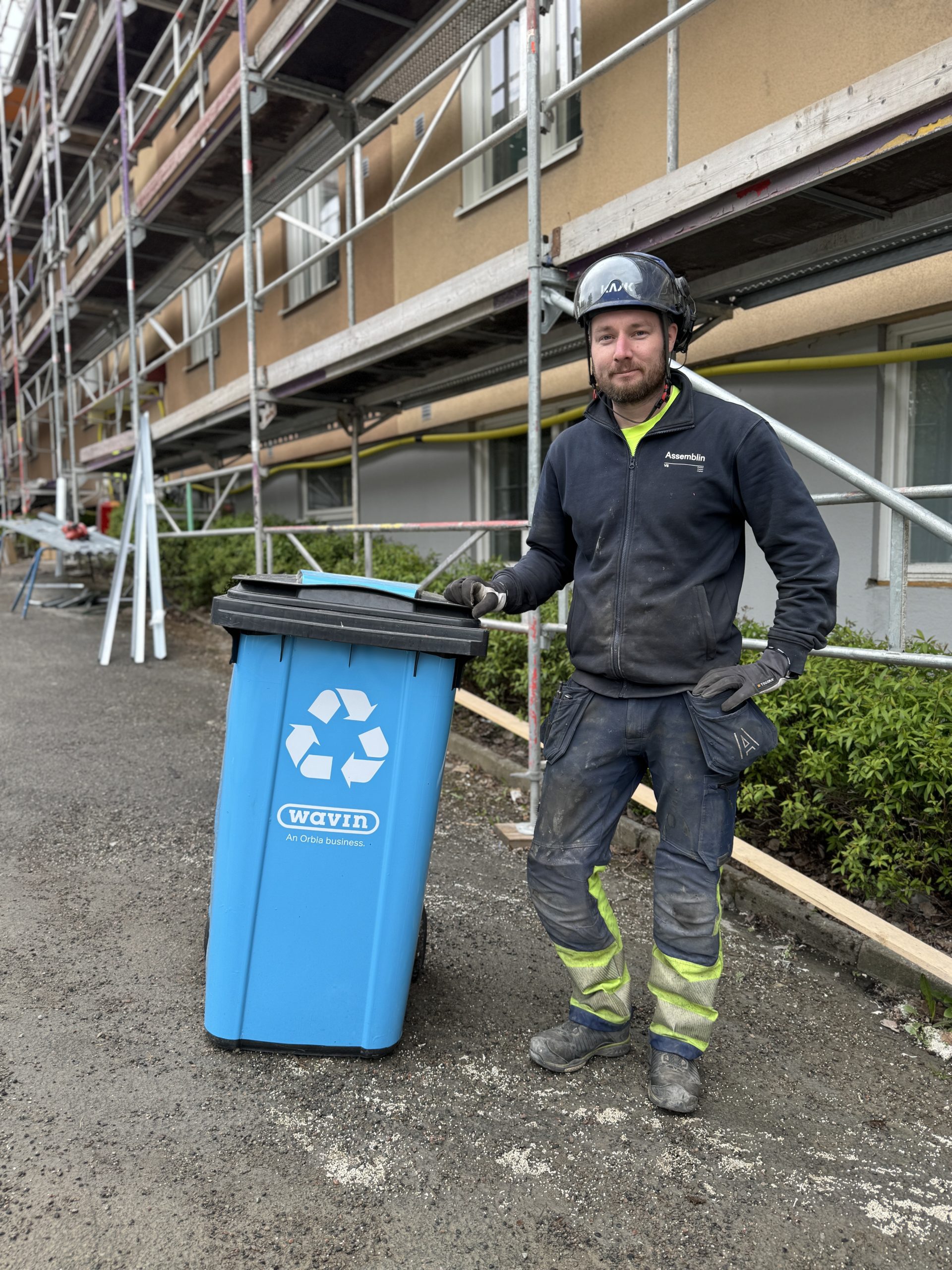 – Det är alltid lite spill, särskilt i ROT-projekt där vi jobbar med gamla handritningar. De är inte exakta, så vi måste måttanpassa mycket på plats. Då är det en enorm vinst att kunna återvinna spillet istället för att kasta det. Det är också en strategisk fördel, då vi redan har hårda krav på miljösortering. Att ha ett eget kärl för plaströr som går tillbaka i produktionen är både enkelt och helt rätt ur ett klimatperspektiv, säger Maria Ahlin, projektledare på Assemblin VS.
