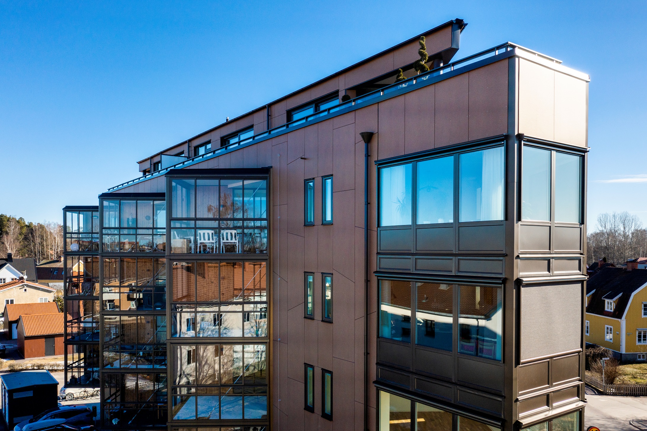 Välkommen till Brf Strykjärnet i Karlstad, ett flerfamiljshus med 25 bostadsrätter uppdelat på fem plan och en takterrass. Huset har fått sitt speciella namn efter sin form, som skvallrar om ett modernt hus med unik arkitektur. Till fasaderna har företaget Rockpanel levererat obehandlade fasadskivor med bronsfärgad patina som framhäver husets form och samtidigt möter krav på såväl funktion som estetik.