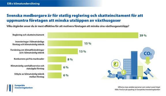 Som svar på frågan om hur företagen kan uppmuntras att minska växthusgasutsläppen angav många svenskar (39 %) att de är för bestämmelser. Detta är dock färre än EU-genomsnittet (52 %). Närmare bestämt anser 23 % av svenskarna att bestämmelser och påföljder skulle vara den mest effektiva åtgärden och 16 % tror på skatteincitament genom subventioner och skattesänkningar för att uppmuntra grönare affärsmodeller – se figur 1 för mer information.