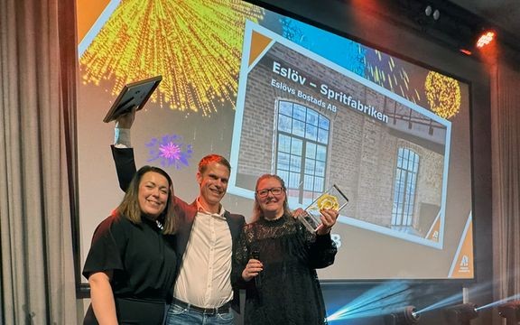 Priset delades ut på onsdagskvällen under Allmännyttans Fastighetsdagar i Eskilstuna. På plats fanns bland andra Eslövs Bostads AB:s vd Kristina Forslund, fastighetsförvaltningschef Frida Stenlundh och fastighetsutvecklingschef Johan Andersson.