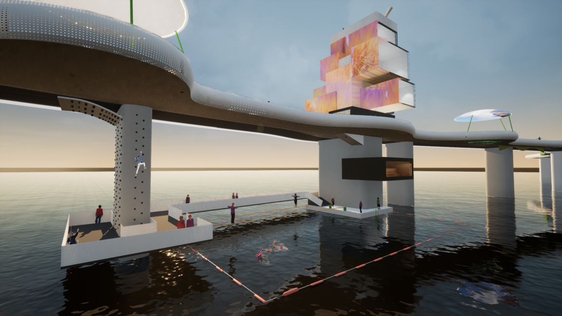 Enligt konceptet ska byggnaden uppe på bron inrymma konstateljéer, caféer och öppen verksamhet. Byggnaden under bron kommer erbjuda bastu med badmöjligheter sommar- och vintertid och bryggor för fiske. Vintertid kan bastun bli en målpunkt för aktiviteter på isen så som skidåkning och skridskor. Brostöden kan även användas som klätterväggar och slacklinelinor för dig som söker utmaningar.