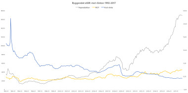 I den här rapporten kollar man närmare på relationen mellan byggandet och ränteläget. Byggfaktas databas sträcker sig ända bak till början av 90-talet, de har här separerat nyproduktions- och ROT-marknaden för byggande av samtliga lokaler och husbyggnationer. Den grå linjen är den summerade kostnaden av igångsatta nyproduktionsprojekt, den gula är det samma fast för ROT-projekt medan den blå linjen är den korta räntan.