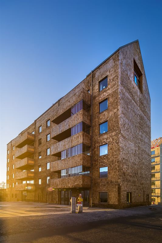 De fyra nya kvarter i Sundbyberg Strandpark är vackert klädd i cederträ och är den stora snackisen i byggbranschen just nu. Standparken är et av årets byggnader som är nominerade till Träpriset 2016.Foto/arkitekt: David Bicho/Wingårdhs