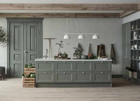 Den gröna trenden kommer bli allt starkare under kommande år och nu lanserar Marbodal en helt ny grön kulör på köksluckor. Färgen är en dov och lugn färg som skiftar beroende på ljus ­­– från en ljusare grön till en mer mättad färg, vilket skapar ett levande kök. Kulören är enkel att matcha med olika typer av material och nyanser och passar lika bra på en lantlig kökslucka som på en slät lucka i ett minimalistiskt kök. Den platsbyggda känslan förstärks genom att snickerier och dörrfoder är målade i samma gröna kulör som köket.