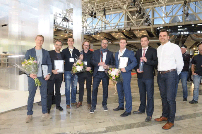 Bilden: Vinnarna av Glaspriset 2018 fr v Erik Sällström, Lerstenen, Niklas Carlén, Wingårdhs, Pilutaq Larsen Ström, Semrén & Månsson, Tord-Rikard Söderström, Wingårdhs, Peter Forsberg, Lerstenen, Artis Baumanis, Arturas Kvauka och Normunds Ermanssons, UPB.