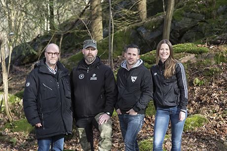 Trion som bidrar till att aktivera området Kallebäcks Terrasser tillsammans med Wallenstams projektchef för området Hans Svensson. Från vänster, Hans Svensson Wallenstam, Tommy Carlsson Military Fitness, Camilo Lattof M.I.T-Fitness och Estelle Montler Göteborgsvarvet. Fotograf: Carolin Freiholtz, Omelettfoto
