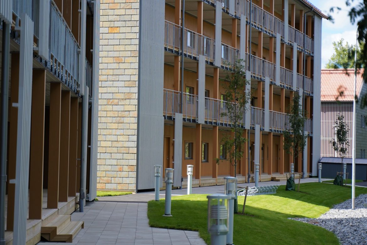 hög hållbarhetsprofil som möjligt. Huskropparna har uppförts med modulhus i trä, dels för att nyttja