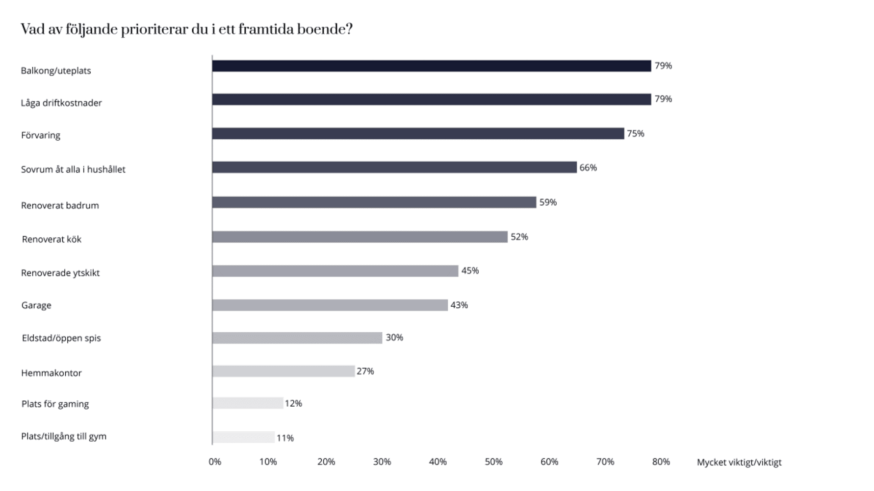 Balkong eller uteplats samt låga driftskostnader, det är vad svenskarna prioriterar mest i ett framtida boende. För många blir också möjligheten till god förvaring samt tillräckligt många sovrum viktigt i nästa hem. Det framkommer av en ny Sifo-undersökning från förvaringsföretaget Elfa.