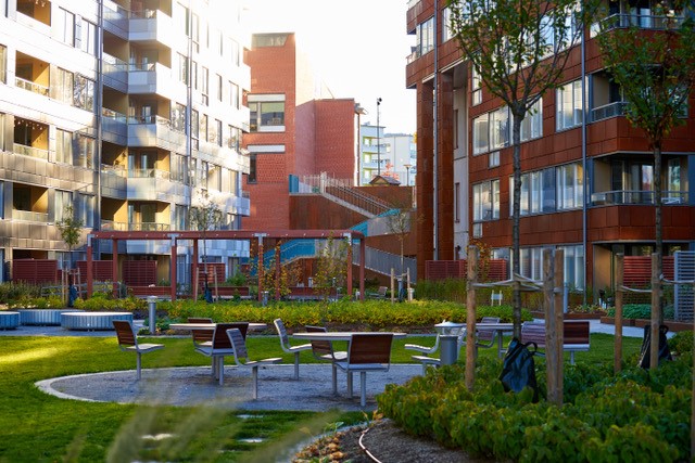 Mellan husen finns grönområde med promenadstråk, cykelparkering och parkbänkar. Under kvarteret finns ett tvåvånings parkeringshus med plats för såväl bilar som cyklar.