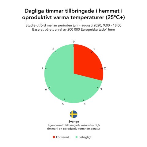 Förra året slogs flera värmerekord i Sverige. Det var bland annat en ovanligt varm vår, sommar och vinter. Enligt en undersökning genomförd av av tado jobbade en svensk i snitt 18 timmar i veckan i en temperatur över 25 grader förra året. Förutom obehag leder ett varmt inomhusklimat till lägre produktivitet och minskad fokus. En kontorsmiljö i Sverige har vanligen en inomhustemperatur på mellan 20 och 22 grader. Världshälsoorganisationen rekommenderar att man helst inte ska jobba i en temperatur som överstiger 24 grader.