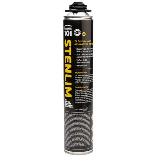 – 101 Stenlim förenklar byggprocessen, eftersom den är klar att användas och appliceras direkt på vad som ska limmas med en vanlig skumpistol. Det sparar mycket tid, och damm samt spill från murbruksblandningen undviks, säger produktchef Lars Petter Bjaaland. Limmet kan användas ned till -5 °C, tål belastning redan efter 30 minuter och är härdat fullständigt efter 24 timmar.