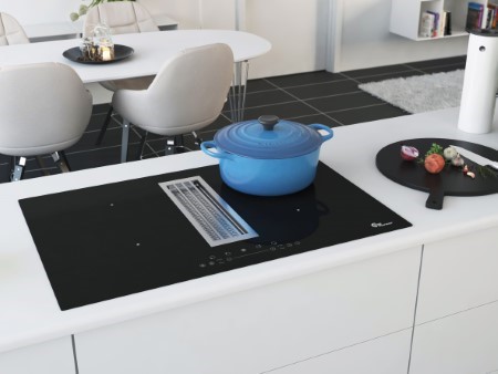 Fläkten sitter under ett diskret designat galler mitt på spishällen. Den har samma fördelar som en traditionell fläkt med bl.a. fettfilter och en separat motor som kan placeras på valfri plats i skåpet under spishällen. Om det kokar över och det rinner ner vätska i fläkten samlas den upp i en speciell behållare. Det finns tre fläktstyrkor och en boostfunktion – och luften kan antingen ledas ut eller föras tillbaka till köket genom recirkulationsfilter.Trots att fläkten har hög kapacitet och kan förflytta upp till 550 m³ luft i timmen har den energiklassningen A+. Induktionshällen Hood in Hob har fyra zoner med en samlad effekt på 7,2 kW – varav två zoner har en boostfunktion på 2,3 kW.