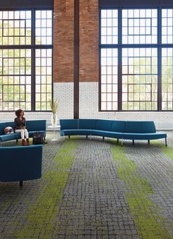 Interface ställer höga hållbarhetskrav. I Human Connections®-kollektionen används 100 % återvunnet garn och golvplattorna består i genomsnitt av hela 56 % återvunnet material. Kollektionen använder Interface TacTilesTM installationssystem, som eliminerar behovet av lim och skapar ett ”flytande” golv som enkelt kan uppdateras i framtiden.