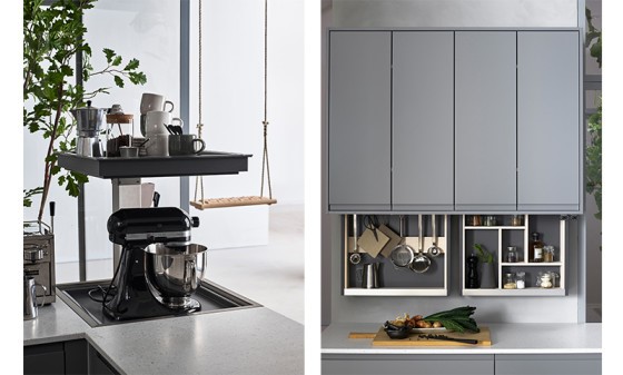 Väggskåp med hissfunktion – Höj- och sänkbart väggskåp som öppnar upp för helt nya möjligheter. Med en enkel knapptryckning sänks skåpets bakre del till önskad nivå och man kommer enkelt och bekvämt åt redskap, kryddor, knivar och annat som man vill ska vara lättillgängligt när man lagar mat. Välj mellan fyra olika inreden som tillbehör till den nedsänkta delen med plats för allt från kryddburkar och flaskor till upphängningskrokar, magnethållare för knivar och vinställ. Skåpets främre, grundare del, ger bra överblick över innehållet, och fungerar i övrigt som ett helt vanligt skåp.