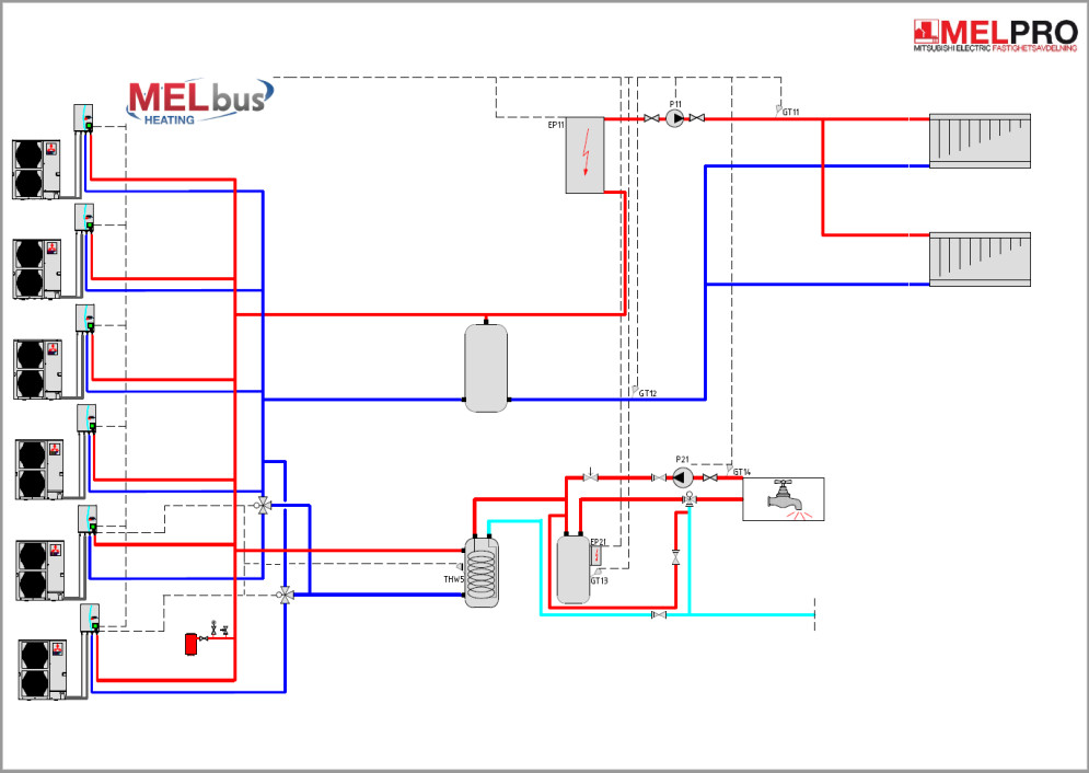 MELbus Heating är en standardiserad värmecentralstyrning optimerad för anläggningar med Mitsubishi Electric värmepumpar.