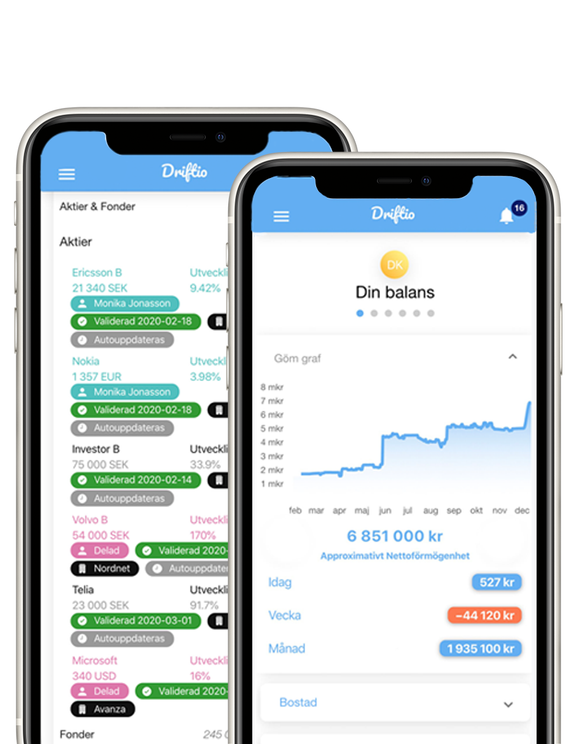 Driftio är en ny och världsunik App och Webb-tjänst som digitalt samlar in tillgångar och skulder och automatiskt dagligen uppdaterar dessa värden. Resultatet innebär att våra användare får full insikt i den dagliga utvecklingen av värden på sin bostad, pension, aktier, fonder och lån, på bara 10 sekunder. Detta oavsett hur många banker, pensionslösningar från olika arbetsgivare eller långivare som användaren har. Genom att erbjuda daglig kontroll över balansen mellan tillgångar och skulder minskas också våra användares finansiella stress oro avseende marginaler för sina lån. Detta är extra viktigt för privatpersoner i dessa tider med osäkra arbetsförhållanden och bostadspriser samt volatila börser. Med Driftio kan våra gratisanvändare dessutom på ett unikt sätt kontrollera vem som får åtkomst till sin personliga finansiella data. Data kan enkelt delas helt säkert med vilka personer, företag och banker som de vill. Lika lätt kan åtkomsten till deras data återkallas.