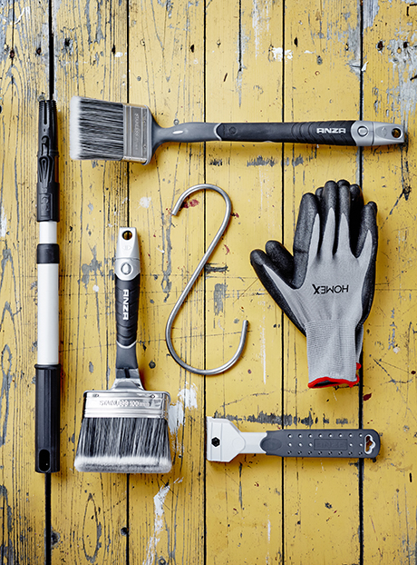 Bilden: För bästa reslutat när du målar om din fasad rekommenderas Anza Platinum vinklad fasadpensel och Platinum långvinkelpensel tillsammans med ett förlängningsskaft. Färgskrapa, burkhållare och handskar med supergrepp underlättar arbetet.