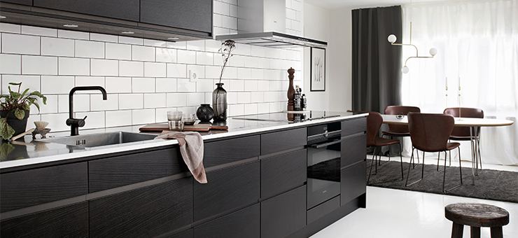 Årets nyhet när det kommer till kök är luckan Line i en vacker mörkbrun, matt färg på liggande askfanér. Grepplisten är strukturlackad i en matt grafitgrå kulör och blir en lyckad färgkombo till det mustigt bruna.
