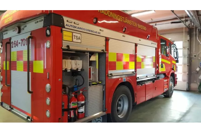 Bilden: Räddningstjänsten i Båstad har en litiumsläckare i sin bil på huvudstationen.