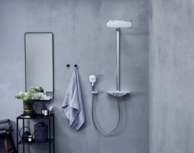 Oras kombinerar välbefinnande med sofistikerad estetik och höjer den dagliga duschupplevelsen till en ny nivå. Oras Esteta är en lösning för inredningen i ett modernt badrum. Duschblandaren har en elegant design med vred för temperatur och flöde och är lätt att justera och använda. En avställningsyta i säkerhetsglas ger ett stilrent intryck och dessutom gott om förvaringsutrymme, finns i vit eller mörkgrå. Takduschen är modern i sin form och ger en härlig känsla av ett naturligt regn.