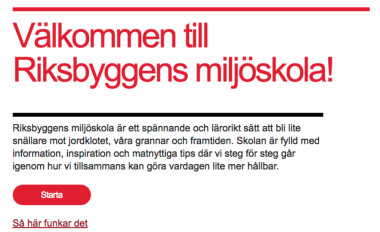 Miljöskolan ligger öppen på Riksbyggens hemsida och är tillgänglig för alla. Miljöskolan är fylld med information, inspiration och matnyttiga tips där vi steg för steg går igenom hur vi tillsammans kan göra vardagen lite mer hållbar. Utbildningen är indelad i fyra avsnitt: Äta, Resa, Bo och Shoppa. Det finns också ett test inlagt i skolan, ”Min miljö”, där deltagarna kan kolla hur många åtgärder de är beredda att göra för att bidra till en bättre miljö.