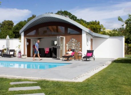 – Huset är ett perfekt komplement till poolen som uppskattas av såväl stora som små. Användningsområdena är många och väl på plats står det sig i ur och skur. Att det är murat och putsat gör det hållbart och okänsligt för fukt, vilket givetvis kommer väl till pass, säger Veronica Jensen på Finja.