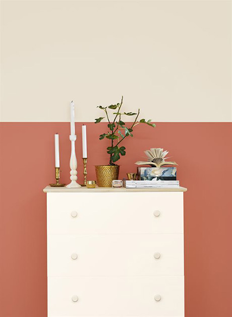 – Reef är ljusare och mer informell än rött men även mer rikare och mer romantisk än orange. När jag stylade ”The Graphic” valde jag att måla väggen i två kulörer, det är ett bra sätt att skapa dramatik. Jag tycker också att metaller som mässing passar perfekt ihop med kulörerna, säger Johanna.