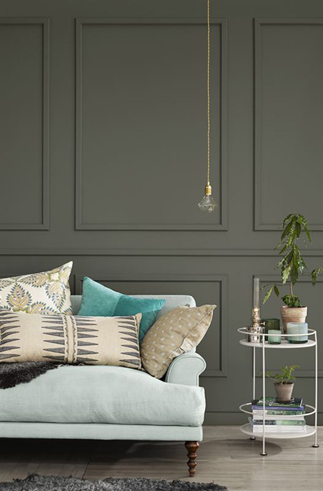 – Leafy passar fint på sovrumsväggen eller i vardagsrummet. I ”The Nostalgic” har jag matchat Leafy med kulörer som liknar Mason, för att förstärka den naturliga och nästan jordiga känslan. Jag tycker inte att man ska vara rädd för att använda en mörk väggkulör, men det blir allra bäst i rum med mycket textilier. Och gärna med mönster som bryter av och skapar liv! Säger Johanna Bradford.