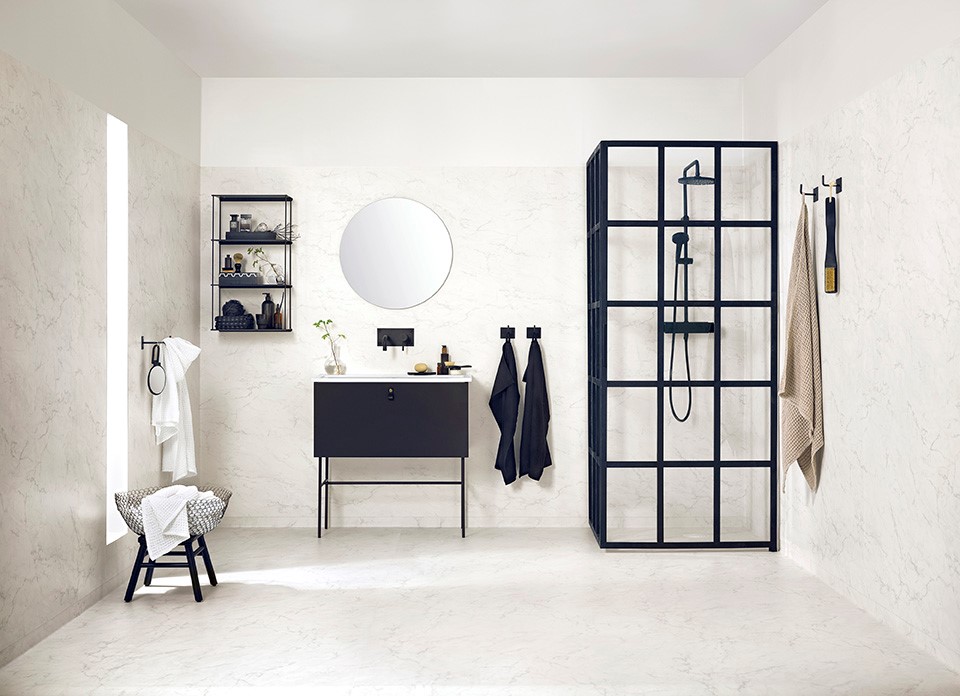 Hög designfaktor och ett nytänk präglar Tarketts nyheter marmor, bladmönster och guld i Aquarelle-kollektionen. Vinyl i badrum är varmt och skönt att gå på även utan golvvärme. Självklart uppfyller golv- och väggmaterialen de allra tuffaste kraven när det kommer till vattentäthet. Nyheten Marble Carrare White finns för både golv och väggar och ger den lyxiga, klassiska stilen. Marmorkänsla, men med betydligt mer färg, skapas med golvet Royal Marble Green där bården Decor Ornament Green passar mycket fint till.