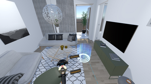 Utrustningen i sig är inte skrymmande, utan består av ett par VR-glasögon, två sensorer på stativ som känner av när besökaren ”rör sig i lägenheten” samt en handkontroll – som i ett spelprogram! Därtill kommer en kraftfull speldator.
